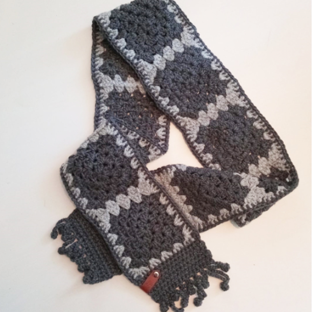 This subdued crochet scarf can be dressed up with work wear or dressed down with some cool blue or black jeans. Match it up with one of our bags! Made from acrylic wool knits in grey and charcoal with a playful bobble string fringe.CARE INSTRUCTIONSStandard machine or hand-wash - use a lint roller to maintain the fluffies. When wet lay flat to dry.